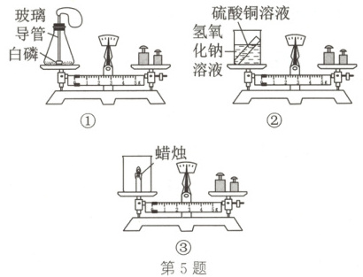 5. D 解析:实验①中白磷燃烧生成五氧化二磷,在密闭装置中进行,可以验证质量守恒定律;实验②中氢氧化钠与硫酸铜反应生成氢氧化铜沉淀与硫酸钠,发生了化学变化,可以验证质量守恒定律;实验③中蜡烛燃烧生成二氧化碳与水,有气体参加反应、生成,必须在密闭的装置内进行实验才能验证质量守恒定律,故实验③不能直接用于验证质量守恒定律,A正确。该反应放热,若装置未冷却至室温,气球膨胀,产生浮力,会导致指针向右偏转,B正确。实验②无气体参加、生成,且符合质量守恒定律,故实验②反应前后天平始终保持平衡,C正确。实验③蜡烛燃烧消耗氧气,生成二氧化碳和水,根据反应前后物质的总质量不变,则固体减小的质量为释放到空气中的水蒸气与二氧化碳的质量总和减去消耗的氧气的质量,D错误。