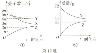 12. C 解析:由图①可知,X和Y是反应物,Z是生成物,由分子数目的变化情况可知,该反应可表示为3X + Y =\!=\!= 2Z。由图②可知,t s时参加反应的Y的质量为72g - 44g = 28g,生成Z的质量为34g,则t s时参加反应的X的质量为34g - 28g = 6g。由该反应的化学方程式3X + Y =\!=\!= 2Z可知,该反应属于化合反应,因此生成物Z一定是化合物,A正确;参加反应的X与Y的质量比为6g:28g = 3:14,B正确;由化学方程式可知,反应前后分子总数改变,C错误;设Y、Z的相对分子质量分别为x、y,由化学方程式可知,$\frac{x}{2y}$=$\frac{28g}{34g}$,则$\frac{x}{y}$=$\frac{28}{17}$,D正确。故本题选C。