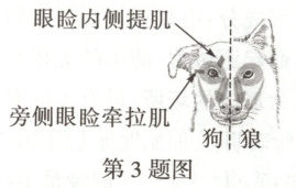 3. (2024河北22题)狗由古代狼经长期驯化而来。科研人员对比狗和狼的面部肌肉,发现大多数狗的眼周围多了两块肌肉,如图所示。这两块肌肉相互配合使狗能表现出“可怜巴巴”的表情,但哈士奇(狗的品种)没有旁侧眼睑牵拉肌。下列说法错误的是(