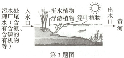 3. (2025 内蒙古)为落实国家加强非常规水源利用的环保要求,内蒙古某地将污水处理厂尾水引入一人工湿地,利用该湿地的净水功能,让“一泓清水入黄河”的同时美化了环境,吸引众多游客观光游憩。如图为该人工湿地的示意图,回答下列问题。