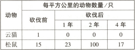 (2)[原因分析]根据表格数据分析,砍伐后的 4 年内,该森林中松鼠的数量变化趋势是先增加后