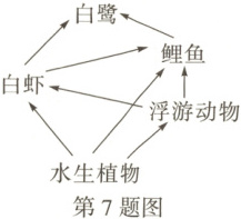 7. (2025 驻马店) 宿鸭湖湿地凭借优越的区位生态和人文关怀已成为中国最大的人造鸟类栖息地,填补了珍稀候鸟迁徙美丽中国的关键拼图。该湿地生态系统中部分生物构成的食物网如图所示。下列叙述正确的是 (