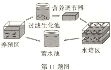 11. (2025 云南) 现代鱼菌菜共生系统采用循环经济原理,以腐生微生物为枢纽,将水产养殖与水培技术有机结合。如图为鱼菌菜共生系统简图,据图回答下列问题。