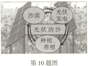 10. (2025 定心卷) 河北省承德市围场满族蒙古族自治县建设了全省首个光伏治沙试点项目,探索了“板上发电、板下种植、板间养殖”的系统化开发模式。通过多种创新模式推进光伏产业与生态治理融合发展,其模式如图所示。