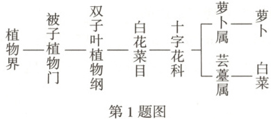 1. (2024河北6题)萝卜、白菜是常见的蔬菜,这两种植物在生物学上的分类地位如图所示。图中包含植物种类最多的分类等级是(