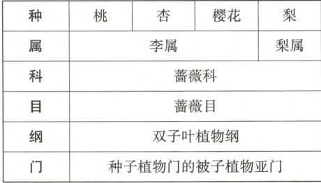 2. (2025石家庄模拟改编)早春时节,街头常见桃花、杏花、梨花、樱花争奇斗艳,令人赏心悦目。四种植物的分类关系如下表,以下相关说法错误的是(
