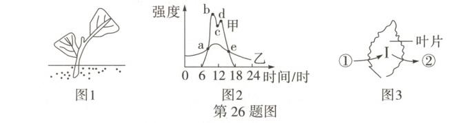 (3)图2中b时光合作用强度大于呼吸作用强度,说明此时刻植物吸收二氧化碳,释放氧气,则图3中的①代表二氧化碳,②代表氧气。