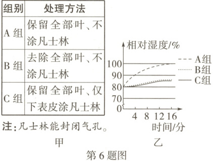 6. (2025 湖南)为探究植物散失⽔分的结构,兴趣⼩组取同⼀株⼩叶⼥贞树上相同⼤⼩的枝条,按图甲处理后,分别置⼊相同密闭容器,在相同环境下放置⼀段时间后,测量数据如图⼄。请据图回答问题。