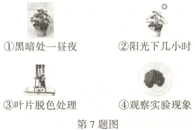 7. (武老师快答 App·答疑高频试题32次)如图表示“绿叶在光下制造有机物”的部分实验步骤。下列相关叙述正确的是(