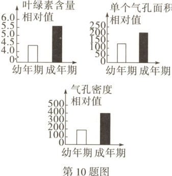 10. (2025 广西)广西青梅是我国一级保护野生植物,主要分布在广西和云南。广西青梅的成年树木生长良好,但幼苗较难正常生长为成年树,导致它的繁衍受到严重限制。科研人员对广西青梅不同生长发育阶段叶片结构和生理差异进行了研究,结果如图所示。回答下列问题。