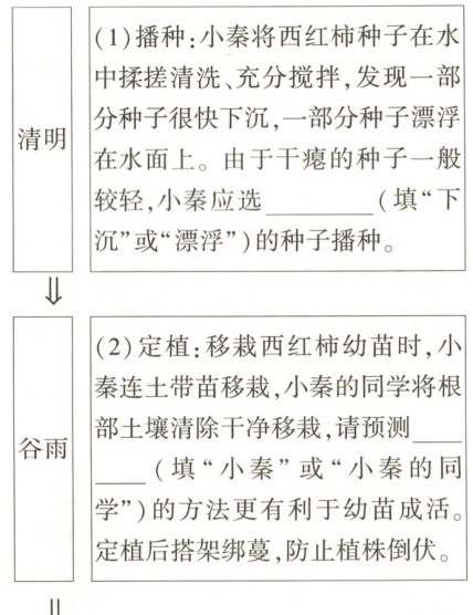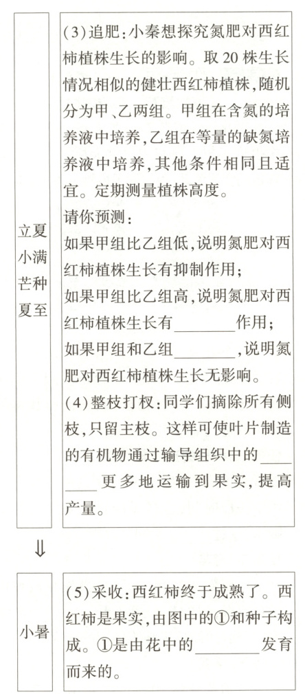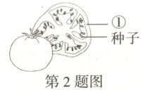 2. (2025 陕西改编)二十四节气是我国古代劳动人民智慧的结晶。古人通过二十四节气,可以清楚地了解一年中季节、气候、物候的变化规律,气温高低及降雨情况等。二十四节气可以指导传统农业生产,也与植物的生命历程息息相关。学校组织了“弘扬优秀文化,体验劳动之乐”实践活动,小秦和同学们依据节气种植西红柿。下图是西红柿果实及横切示意图。请你与小秦一起共悟劳动之理、共享劳动之果,回答问题。