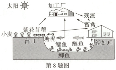 8. (2024河北27题)发展生态农业,助力乡村振兴。某地积极开发低洼盐碱地渔农综合利用模式,如图所示。回答下列问题。