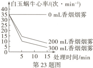 23. 某兴趣小组为探究香烟烟雾对动物的伤害,以白玉蜗牛为对象进行了实验。结果如图,下列有关叙述不正确的是(