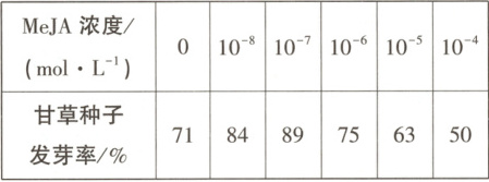 2. (2025 定心卷)甘草的根及根状茎可供药用,有益气、解毒、调和诸药等功效,人工种植甘草能够缓解野生甘草的供应不足。科研人员研究茉莉酸甲酯(MeJA,可用作植物生长调节剂)对甘草种子萌发的影响,结果如下表。下列说法错误的是 (
