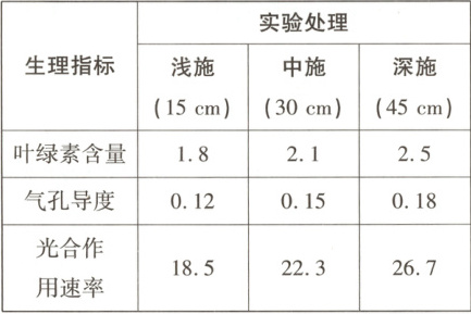 1. (2024 河北 12 题)为研究施肥深度对干旱条件下小麦光合作用的影响,研究人员在相同条件下,选择符合实验标准的三个地块施肥、播种,长出植株后进行检测,实验数据(单位已省略)如下表。下列说法错误的是 (