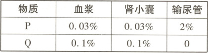5. (2025 许昌)研究被测试者的血浆、肾小囊腔以及输尿管中的液体里面 P、Q 两种物质的浓度如下表所示,请问 P、Q 各是什么物质(