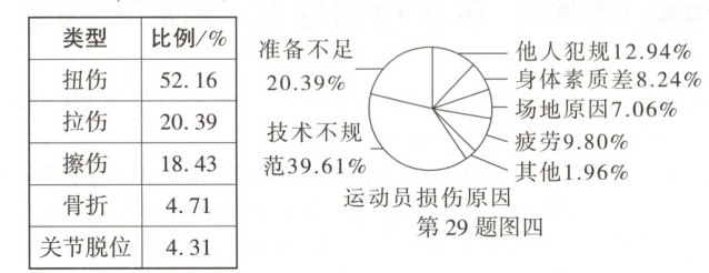 (5)运动员身上经常有损伤,赛事组织人员统计了运动损伤的主要类型和原因,结果如下: