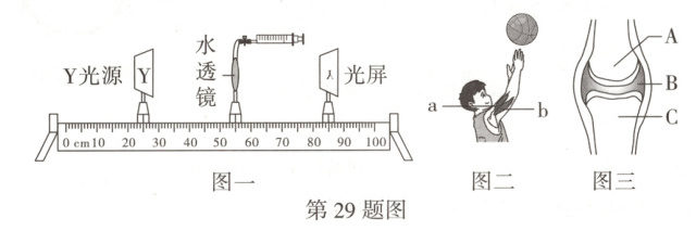 29. (7 分)贵州省台江县台盘村“六月六”吃新节篮球赛,因其激烈的赛况被网友们亲切称呼为“村 BA”。图一是小冀利用物理实验室的光具座及配件来模拟人的眼球成像过程,图三是运动员的关节结构示意图,回答下列问题。