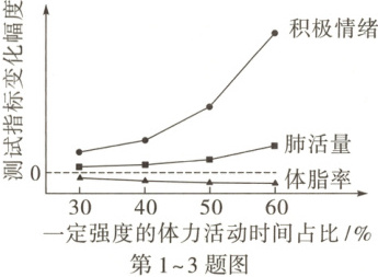 新考法 主题情境 (2025 广东)“少年强则中国强,体育强则中国强。”科研人员研究体育课内一定强度的体力活动时间占比对七年级学生积极情绪及体质(测肺活量与体脂率)的影响,8 周后各项测试指标变化幅度如图。请据此完成 1~3 题。