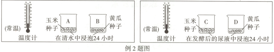 例2 在农业生产中,农民常在播种前将种子进行浸泡处理。用发酵后的尿液浸种是否有利于种子的萌发呢?小冀同学选择100粒玉米和黄瓜种子进行探究,具体过程如下图所示,请据此分析回答问题。