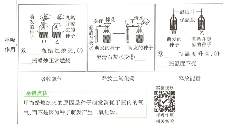1.①二氧化碳 ②有机物 ③筛管 2.④二氧化碳 ⑤能量 ⑥甲 ⑦乙 ⑧浑浊 ⑨甲 ⑩乙