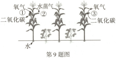 9. (2025 石家庄一模)如图是我国某地实施的“玉米—绿豆”套种模式,该模式取得了玉米、绿豆的双丰收,大大提高了经济效益。图中①②③代表植物体的生理活动。下列说法错误的是(