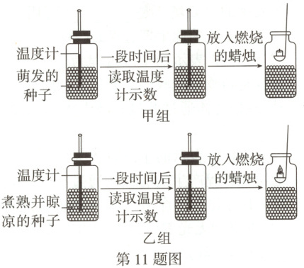11. (2025 北京石景山区改编)同学们在课堂上利用萌发的种子和煮熟并晾凉的种子(初始温度相同)探究植物的呼吸作用,实验过程及结果如图。下列相关叙述错误的是(