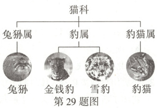 (3)保护区内除雪豹和兔狲外,还有金钱豹和豹猫等猫科动物,图中最小的分类等级是________,其中亲缘关系最近的是________________________。