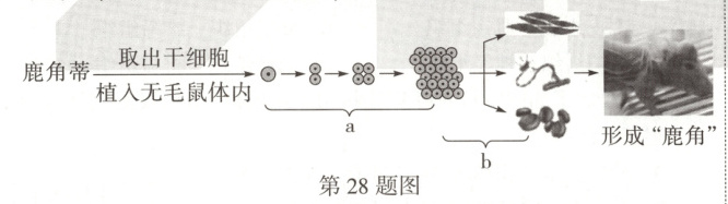 28. (7分)我国科学家将鹿的干细胞移植到无毛鼠头部皮下仅45天,无毛鼠的前额便长出树桩状的“鹿角”,如图表示“鹿角”的形成过程,图中a、b表示细胞的生理过程,回答下列问题。