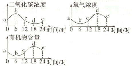 图示中横坐标表示时间,纵坐标分别表示二氧化碳浓度、氧气浓度、有机物含量,曲线表示二氧化碳浓度、氧气浓度、有机物含量随时间变化的趋势。