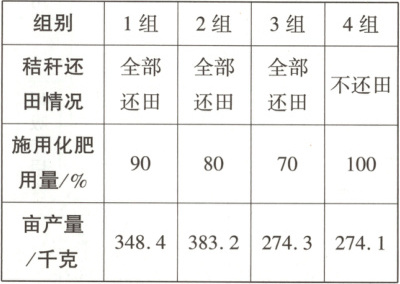 (9)小冀提出:“秸秆还田配合施用化肥,能否减少化肥用量?”为此,小冀查阅了有关论文,相关实验数据如下表: