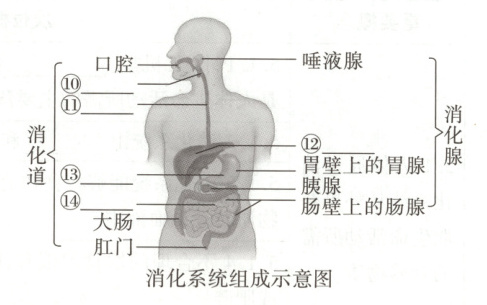 组成:包括口腔、咽、食道(人教版:食管)、胃、小肠、大肠和肛门。其中咽是呼吸道和消化道的共同通道,⑮