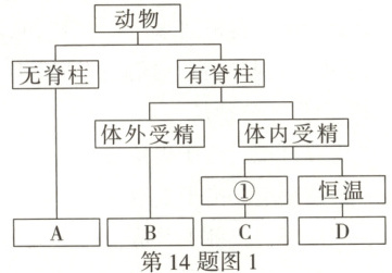 14. (2025 吉林改编)对生物进行分类可以更好地了解生物的多样性。现有蟾蜍、草原雕、蝴蝶和蜥蜴四种生物,请按图 1 对其进行分类并回答问题。