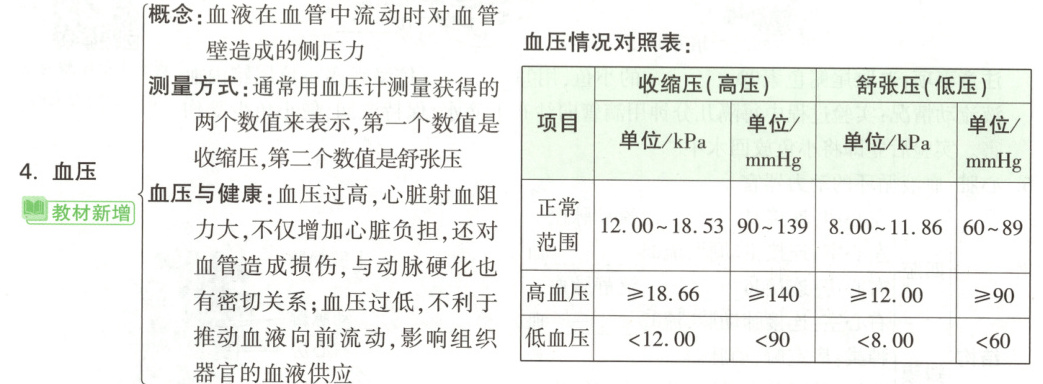 2. 测量方式:用血压计测量,数值表示为收缩压/舒张压(如:12.0 kPa/8.0 kPa)。