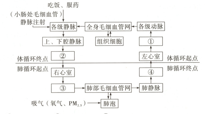 解题思路:通过吃饭、口服药物、静脉注射和输液进入体内的物质,循环起点为小肠处毛细血管(吃饭、口服药物)或静脉血管(静脉注射、输液),循环类型属于体循环。