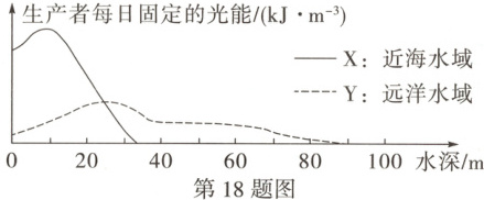 18. 如图为某海洋生态系统中生产者每日固定的光能和水深关系的曲线图,相关叙述正确的是(