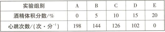 步骤三 用同样的方法,依次观察并记录体积分数为 10%、15%、20%的酒精中水蚤 10 秒内的心跳次数并乘 6,分别设为 C、D、E 组数据。得到相关数据如下表。