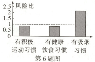 6. (2025 安徽)研究人员针对全球多个国家的不同人群进行了长达 10 年的跟踪调查,得到了在不同生活方式的影响下心血管疾病发生风险的数据,如图所示(注:风险比反映了疾病发生的风险;大于 1 表示风险升高,小于 1 表示风险降低)。下列说法正确的是(