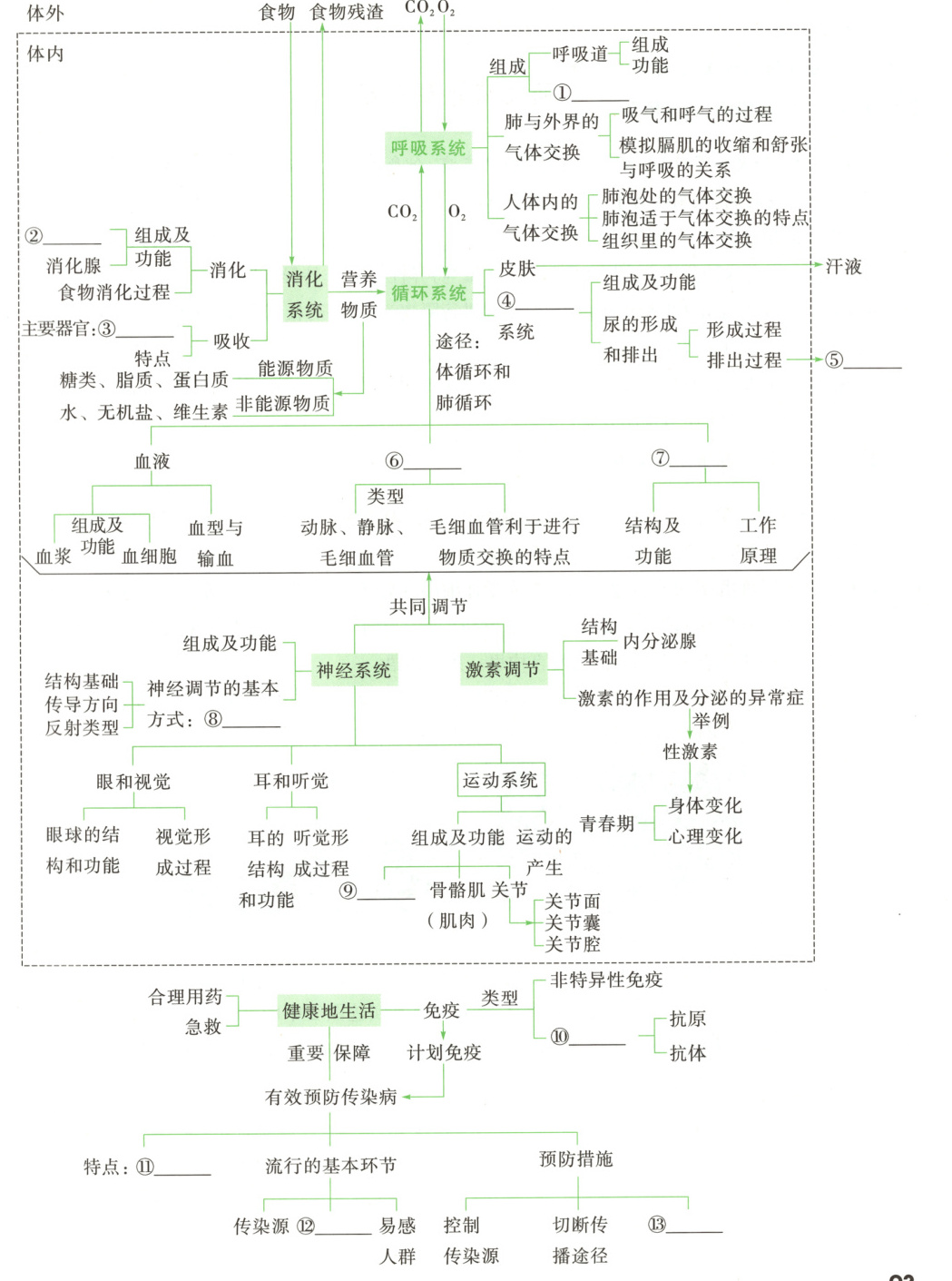 ①肺 ③小肠 ④泌尿 ⑤尿液 ⑥血管 ⑦心脏 ⑧反射 ⑩特异性免疫 ⑪传染性和流行性 ⑫传播途径 ⑬保护易感人群