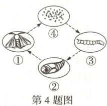 4. (2025 周口改编)中国是世界丝绸的发源地,以发明植桑养蚕、缫丝织绸技术闻名于世。如图包括了家蚕发育的四个时期,下列有关叙述中错误的是(