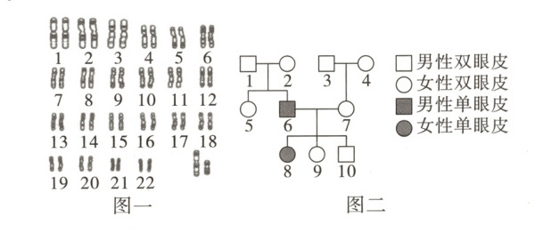 眼皮是一种遗传表型,有单眼皮、双眼皮两种性状表现,它是由父母遗传所决定的。图一是某家族一新生儿体细胞内的染色体排序图,图二是该家族单双眼皮的遗传系谱图(相关基因用 B、b 表示)。请据图回答下列问题。