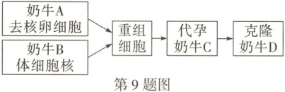 9. (2025 黑白卷)我国利用体细胞克隆技术保存高产奶量的奶牛种质,并成功繁育克隆奶牛。克隆过程如下图所示。以下关于克隆奶牛 D 的分析,正确的是 (