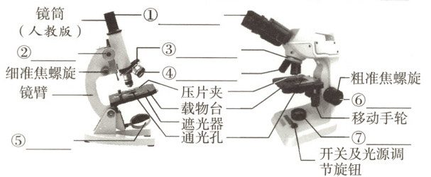 1. ①目镜 ②粗准焦螺旋 ③转换器 ④物镜 ⑤反光镜 ⑥细准焦螺旋 ⑦底光源