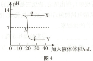 10. (2025·江西)向各盛20 mL等浓度氢氧化钠溶液的两个烧杯中,分别滴加水和稀盐酸,利用pH传感器测得烧杯中溶液pH与加入液体体积的变化关系如图4。下列说法错误的是 (