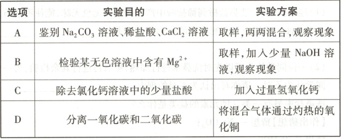 9.A 解析:A.取样,两两混合,其中一种物质和其他两种物质混合时,一个产生气泡,一个产生白色沉淀,该物质是碳酸钠,再把碳酸钠溶液分别加入其他两种物质中,产生气泡的是稀盐酸,产生白色沉淀的是氯化钙溶液,故正确;B.氢氧化钠中的氢氧根离子能和镁离子、铝离子结合产生白色沉淀,利用氢氧化钠溶液不能检验溶液中是否含有镁离子,故错误;C.氢氧化钙和盐酸反应生成氯化钙和水,能除去盐酸,但会引入过量的氢氧化钙,故错误;D.加热时氧化铜和一氧化碳反应生成铜和二氧化碳,除去了一氧化碳,不能达到分离的目的,故错误。