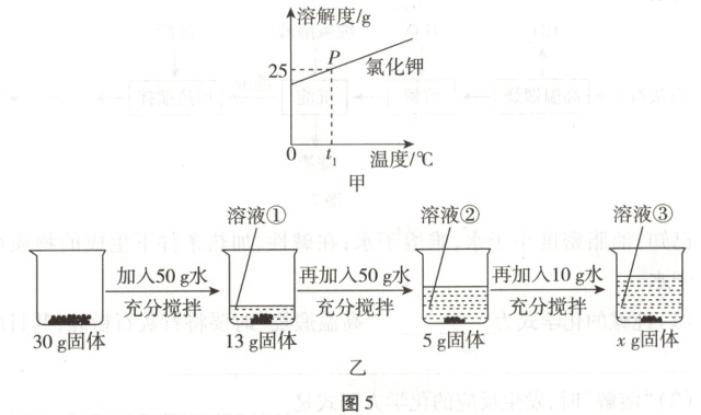13. (2025·陕西改编)(5分)氯化钾的溶解度曲线如图5甲所示,20℃时,将30 g固体(含有氯化钾及不溶于水的杂质)置于烧杯内,进行如图5乙所示的实验,实验过程中溶液温度没有明显变化。