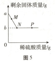 7. 向盛有a g铜锌混合物的烧杯中加入稀硫酸,该过程中剩余固体与加入稀硫酸的质量关系如图5所示。下列说法