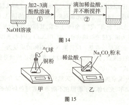 (1)图14所示为探究NaOH溶液与稀盐酸是否发生了化学反应的实验。说明二者发生了化学反应的现象是