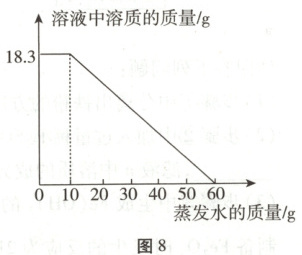 (4)在$40{\hspace{0pt}}^{\circ }C$时,恒温蒸发一定质量的氯化钠溶液模拟海水晒盐的过程,溶液中溶质的质量与蒸发水的质量关系如图8所示。该实验所用氯化钠溶液是