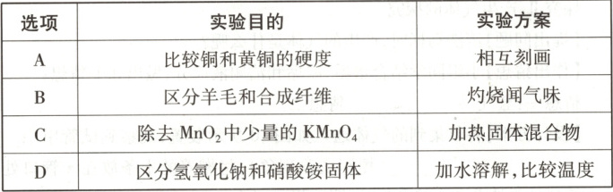 9.C 解析:本题考查实验方案的设计与评价。A.将黄铜片和铜片相互刻画,铜片上留下较多划痕,说明黄铜片的硬度比铜片的硬度大,故正确,不符合题意;B.羊毛的主要成分是蛋白质,灼烧有烧焦羽毛的气味,合成纤维灼烧有特殊气味,可以用灼烧闻气味的方法区分,故正确,不符合题意;C.$\mathrm{KMnO_4}$加热生成锰酸钾、二氧化锰和氧气,引入了新的杂质锰酸钾,达不到实验目的,故错误,符合题意;D.硝酸铵溶于水吸热,氢氧化钠溶于水放热,加水溶解,比较温度,可以区分,故正确,不符合题意。